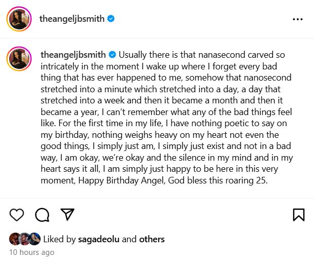For the first time in my life, I have nothing poetic to say on my birthday, nothing weighs heavy on my heart not even the good things, I simply just am, I simply just exist and not in a bad way, I am okay, we’re okay and the silence in my mind and in my heart says it all, I am simply just happy to be here in this very moment, Happy Birthday Angel, God bless this roaring 25."