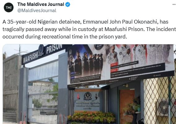 Maldives Correctional Service identified the deceased as Emmanuel John Paul Okonachi.