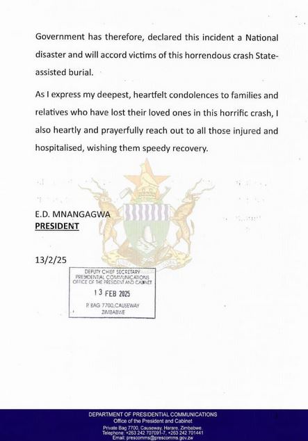President Emmerson Mnangagwa said he was horrified and heartbroken and declared the crash a national disaster. He said the government will take care of funeral and burial expenses.