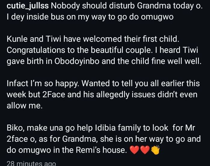 The post reads,”Kunle Remi and Tiwi have welcomed thru first Congratulations to the beautiful couple.I heard Tiwi gave birth in Obgbodooyinbo and the child fine well well”.