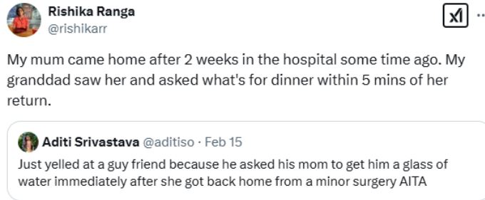 An Indian lady, Rishika Ranga, disclosed that her grandfather asked her mother what she intends to prepare for dinner, five minutes after she returned home from the hospital, where she was admitted.
