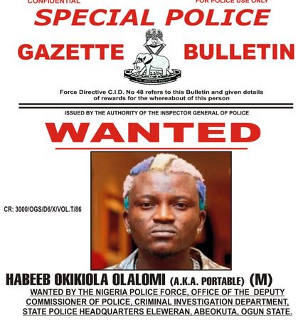 Controversial street artist, Habeeb Okikiola Olalomi, popularly known as “Portable”, has been declared wanted by the Ogun State Police Command for his alleged involvement in a violent attack on government officials carrying out their lawful duties.