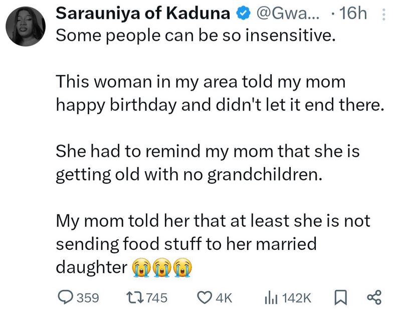 An X user has taken to the microblogging platform to narrate an encounter between her mother and an insensiive neighbour who tried to shame her for not having grandchildren.