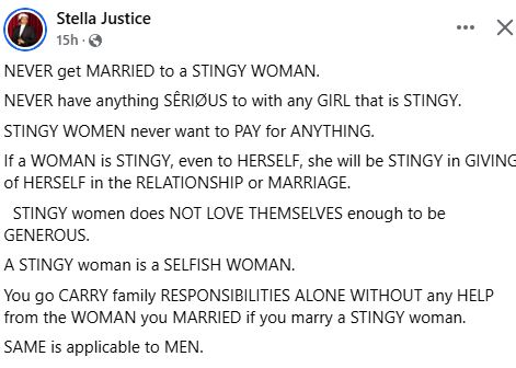 “NEVER get MARRIED to a STINGY WOMAN. NEVER have anything SÊRIØUS to with any GIRL that is STINGY. STINGY WOMEN never want to PAY for ANYTHING. If a WOMAN is STINGY, even to HERSELF, she will be STINGY in GIVING of HERSELF in the RELATIONSHIP or MARRIAGE. STINGY women does NOT LOVE THEMSELVES enough to be GENEROUS. A STINGY woman is a SELFISH WOMAN. You go CARRY family RESPONSIBILITIES ALONE WITHOUT any HELP from the WOMAN you MARRIED if you marry a STINGY woman. SAME is applicable to MEN," she wrote in a Facebook post on Monday.