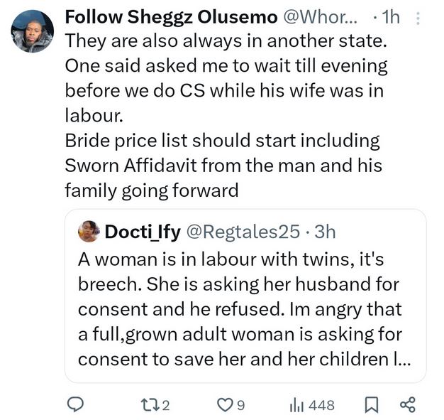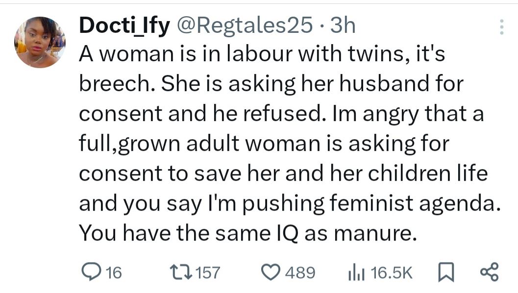 Narrating the incident on X, the doctor wrote: "A woman is in labour with twins, it's breech. She is asking her husband for consent and he refuses.