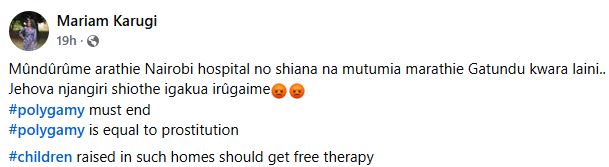 “Mûndûrûme arathie Nairobi hospital no shiana na mutumia marathie Gatundu kwara laini. Jehova njangiri shiothe igakua irûgaime. Polygamy must end. Polygamy is equal to prostitution. Children raised in such homes should get free therapy,” she wrote in a Facebook post on Tuesday.