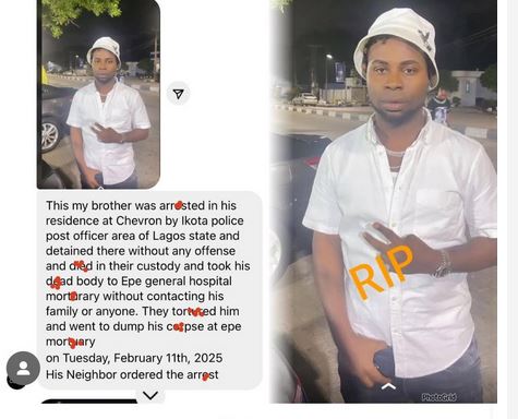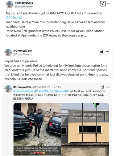 “My cousin, Late Abdulmujid Igbamitayo Oduga, was murdered by @PoliceNG just because of a mere misunderstanding between him and his neighbour. He died at the Ikota Police Post under Ajiwe Police Station located at Ajah under the IOP Azeezat. The corpse was deposited at Epe,” he wrote.