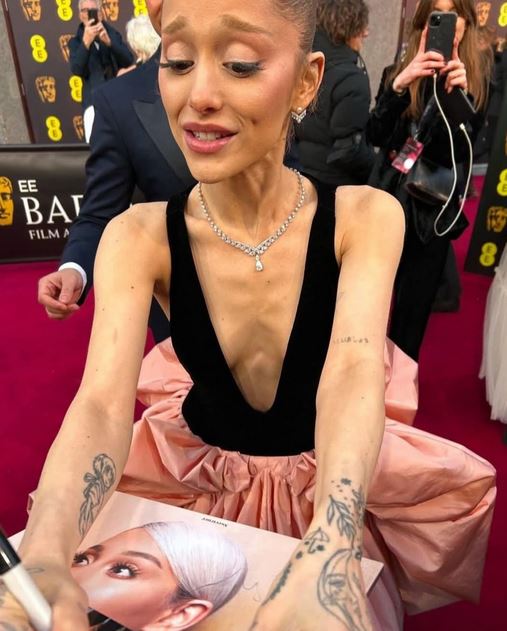 A new photo shows the singer-songwriter signing an autograph at the recent BAFTA Awards in London, wearing an elegant black and blush pink gown.