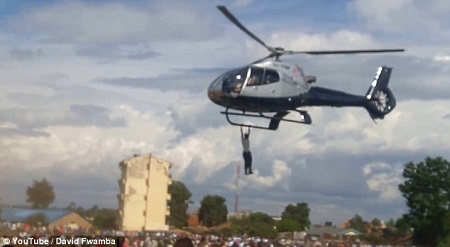 The crazed man, named as Saleh Wanjala alias Sambaka, defied death as he grips tightly to the landing skis during a public viewing ceremony for the body, because he was desperate to catch a glimpse.