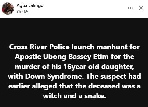 The Cross River State Police Command has reportedly launched a search for a clergyman, Apostle Ubong Bassey, over the d3ath of his 16-year-old daughter, Deborah, accused of witchcraft.