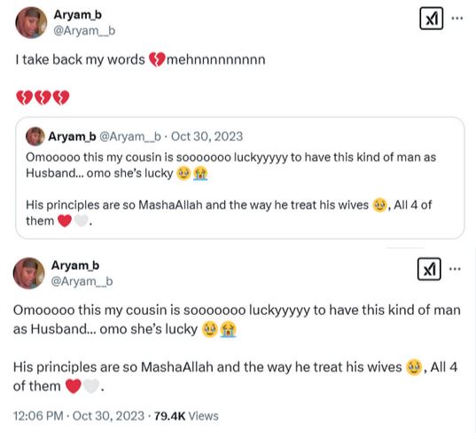 A Nigerian Muslim woman, Aryam, has reversed her stance nearly two years after praising her cousin's husband for his treatment of his four wives.