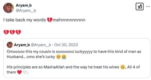 In a post on October 30, 2023, she gushed about the man and how lucky her cousin was to be one of his wives.