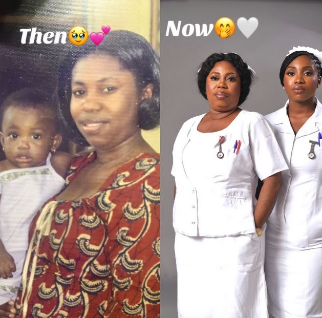 The recent photo shows her now as a nurse, posing with her mother who is also a nurse.