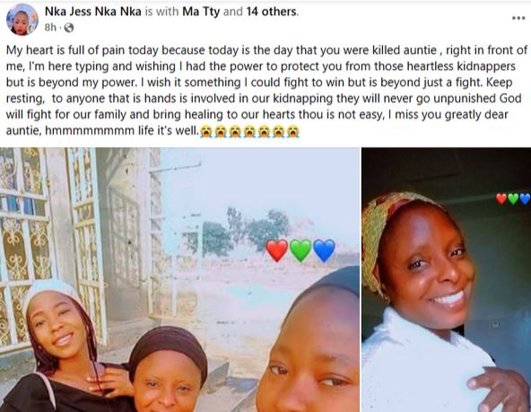 "My heart is full of pain today because today is the day that you were k!lled auntie, right in front of me, I'm here typing and wishing I had the power to protect you from those heartless kidnappers but it is beyond my power," she wrote.