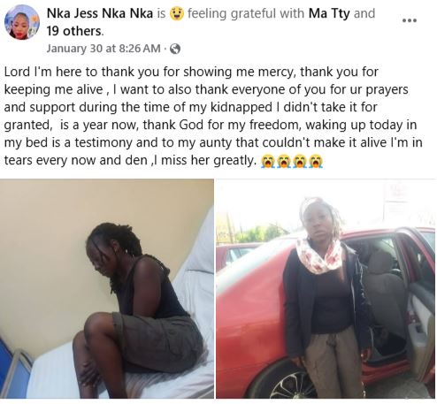 "I want to also thank everyone of you for ur prayers and support during the time of my kidnapped. I didn't take it for granted, is a year now, thank God for my freedom, waking up today in my bed is a testimony and to my aunty that couldn't make it alive I'm in tears every now and den ,I miss her greatly.”