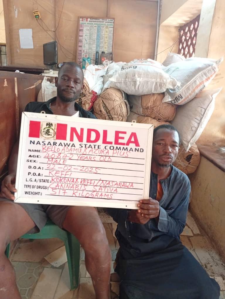 “In Nasarawa State, NDLEA operatives on Saturday, 22nd February, arrested two suspects: Bello Adamu, 40, and Pius Azuka, 42, at Kokona/Keffi with 517kg of skunk, while two other suspects, Usman Ruwa, 43, and Yunusa Haruna, 45, were nabbed in a Toyota Corolla car conveying 62.7 kilograms of skunk along Sabon Asibiti Road, Kontagora, Niger State, on Thursday, 20th February,” Babafemi added.