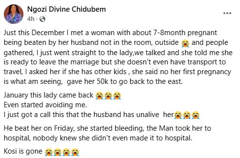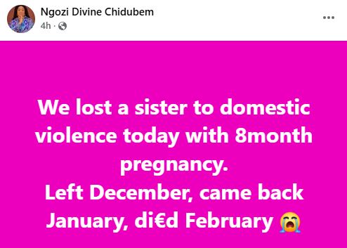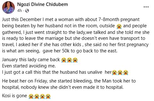 A nurse, Ngozi Divine Chidunem, who disclosed this in a Facebook post on Sunday, February 23 2025, said the woman was allegedly beaten to d3ath by her husband.