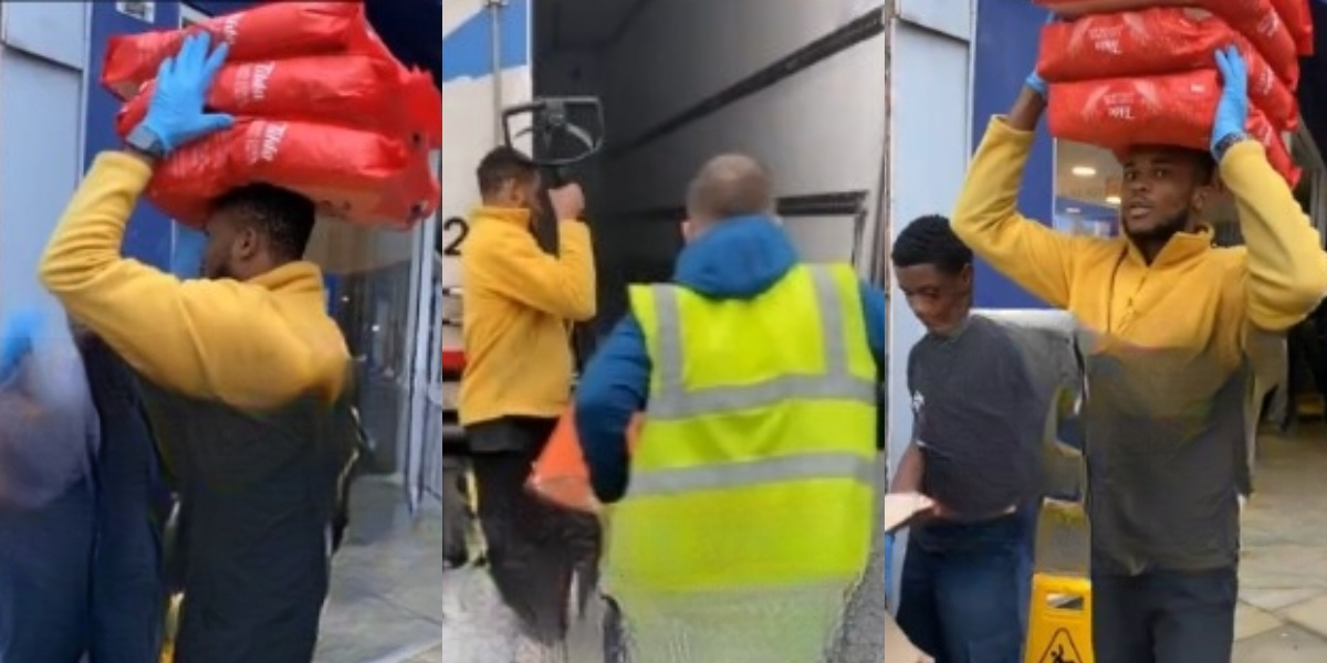 He shared a video of himself lifting and carrying bags and boxes of items from a food warehouse to the delivery vehicle parked on the street.