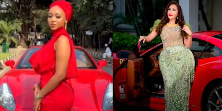 Social media users are reacting to a photo of Laila Charani, the Moroccan wife of Sen Ned Nwoko posing with the same Ferarri used by his sixth wife, Regina Daniels.