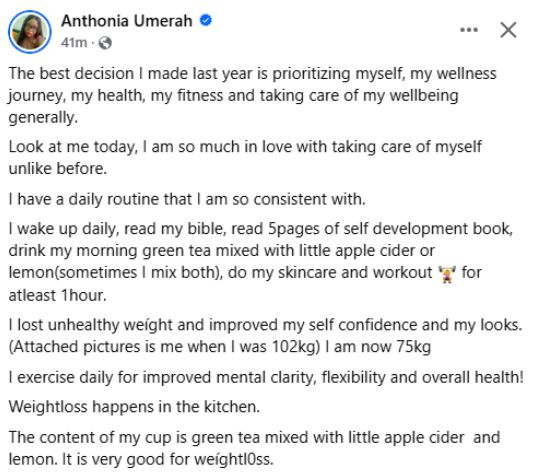 A Nigerian woman, Anthonia Umerah has shown off her weight loss transformation after she went from 102 kg to 75kg.