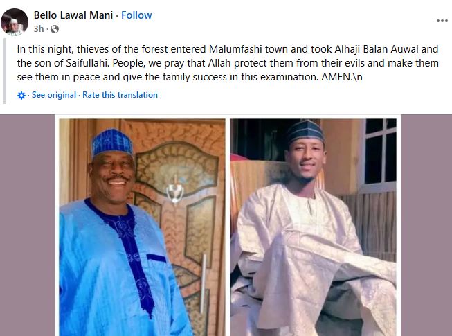 A man identified as Alhaji Balan Auwal and his son, Saifullahi, have been abducted by bandits in Malumfashi Local Government Area of Katsina State.