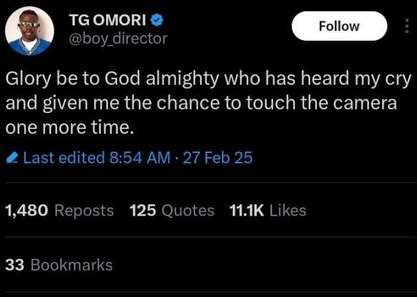 In a statement on X, TG Omori credited God for his recovery, saying: “Glory be to God almighty who has heard my cry and given me the chance to touch the camera one more time.”
