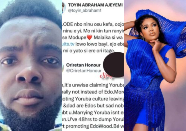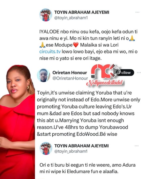 He wrote, “Toyin, it’s unwise claiming Yoruba that u’re originally not instead of Edo. More unwise only promoting Yoruba culture leaving Edo’s.Ur mum &dad are Edos but sad nobody knows this abt u.Marrying Yoruba isnt enough reason.U’ve 48hrs to dump Yorubawood &start promoting EdoWood.Bé wise.”