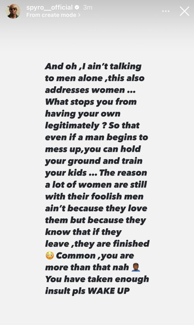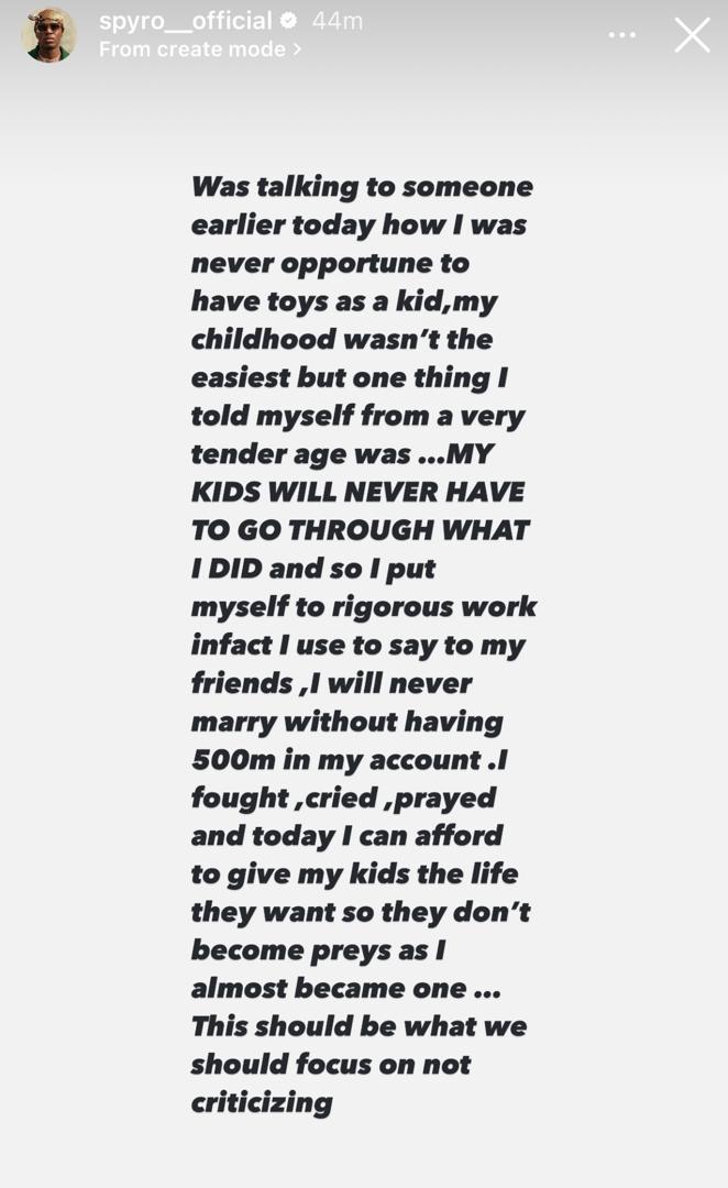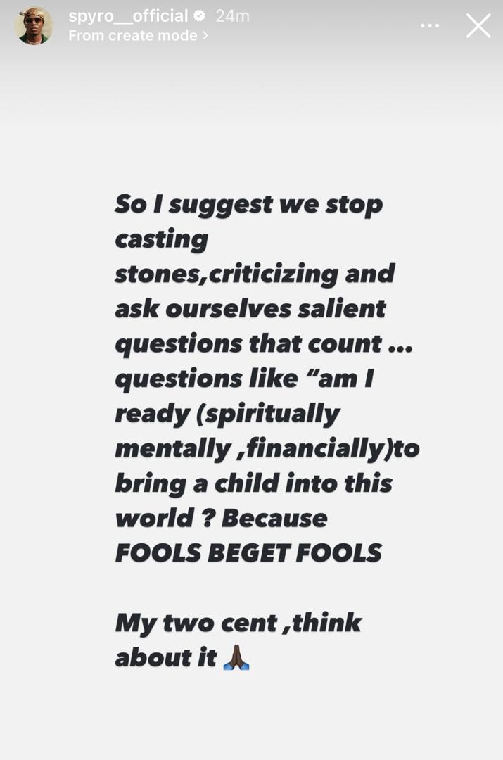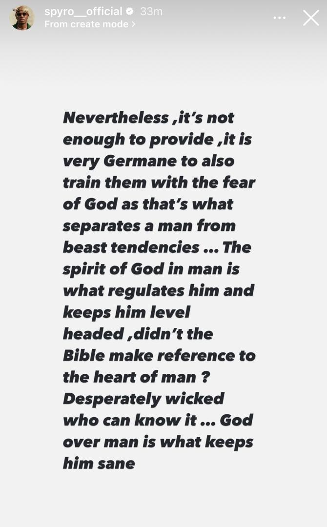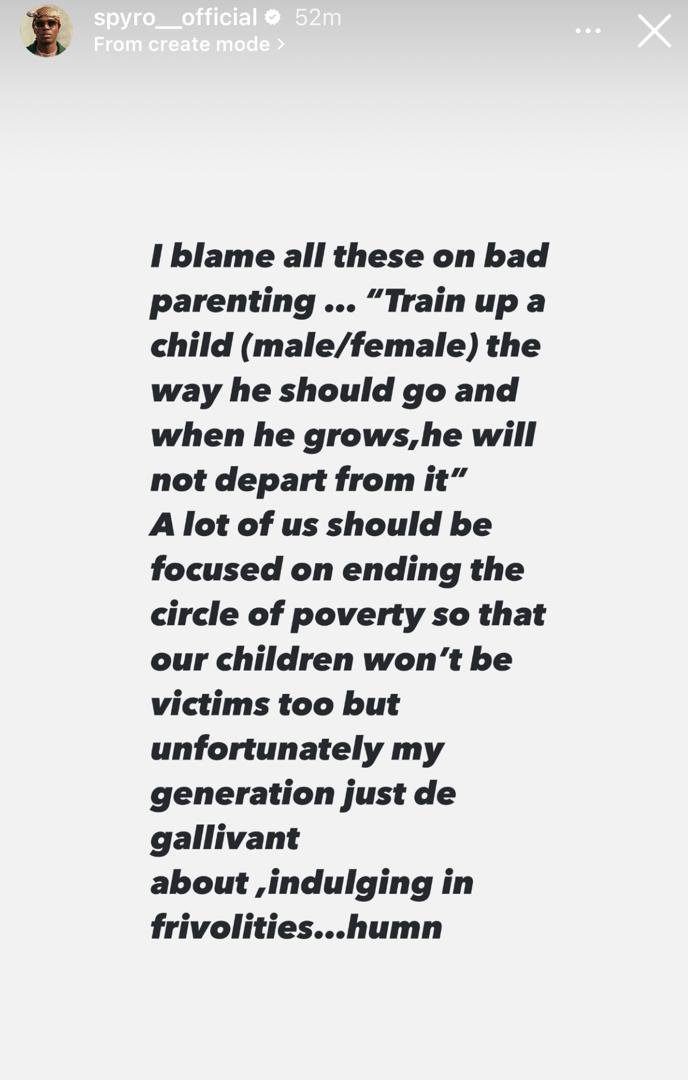 Amid the drama, singer Spyro took to his Instagram Stories to urge parents to raise their children with the fear of God so they would do better as adults.