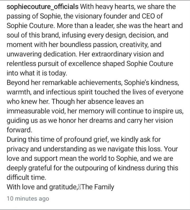 Part of the statement reads, “With heavy hearts, we share the passing of Sophie, the visionary founder and CEO of Sophie Couture.Though her abscence leaves an immeasurable void, her memory will continue to inspire us, guiding us as we honor her dreams and carry her vision forward.