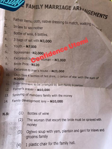 A Nigerian lady, Confidence Utomi, has shared the budget friendly list her family gave to her husband when he came to ask for her hand in marriage.