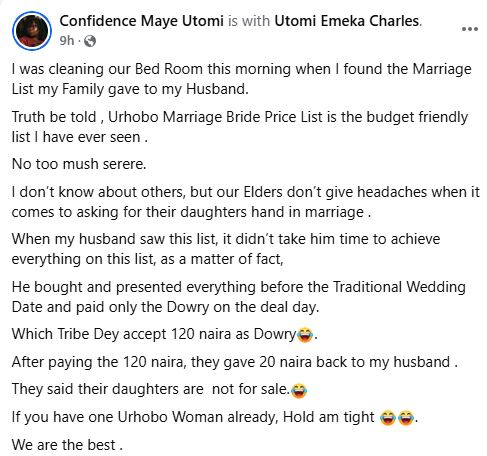 “I was cleaning our bedroom this morning when I found the Marriage List my Family gave to my Husband. Truth be told, Urhobo Marriage Bride Price List is the most budget friendly list I have ever seen,” she wrote in a Facebook post on Thursday.