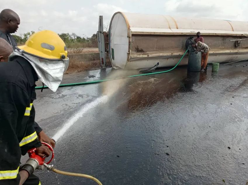 “On arrival, we met a Mack Trailer registration no FGE/667H (Kano) /loaded with 50,000 litres of P.M.S that has summersaulted in the open road and the P.M.S gushing out.