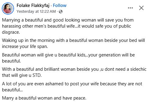 "Marrying a beautiful and good looking woman will save you from harassing other men's beautiful wife...it would safe you of public disgrace," she wrote.