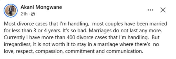 A South African lawyer, Akani Mongwane, has lamented about the high rate of divorce among couples.