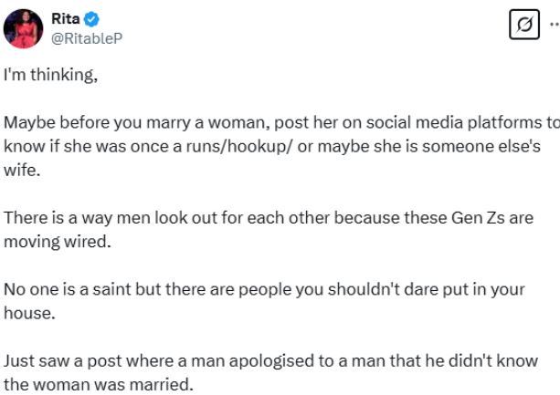 “I'm thinking, Maybe before you marry a woman, post her on social media platforms to know if she was once a runs/hookup/ or maybe she is someone else's wife. There is a way men look out for each other because these Gen Zs are moving wired. No one is a saint but there are people you shouldn't dare put in your house. Just saw a post where a man apologised to a man that he didn't know the woman was married,” she wrote on Monday.