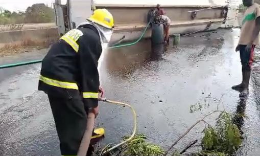 “The team in a bid to avoid fire outbreak swung into action by covering the spillage with foam compound while cautioned members of the public within that environs not to make naked fire that might lead to ignition and subsequent fire outbreak and on standby duty for sometime.