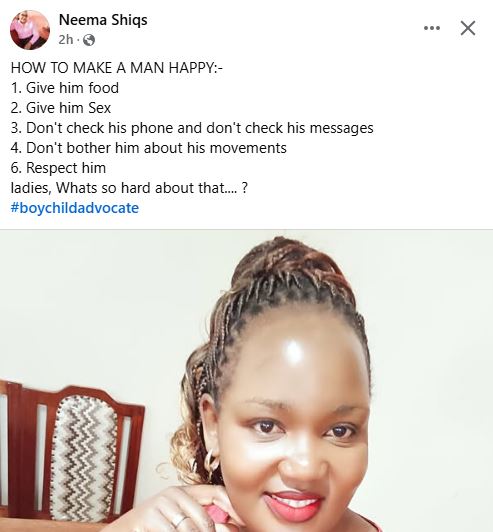 A Kenyan woman, Neema Shiqs, has listed ways a woman can make her man happy.