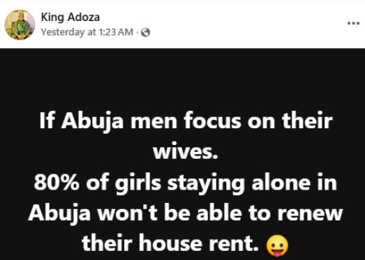 Taking to Facebook, he opined that 80% of girls staying alone in Abuja won't be able to renew their house rents if married men are faithful to their wives.