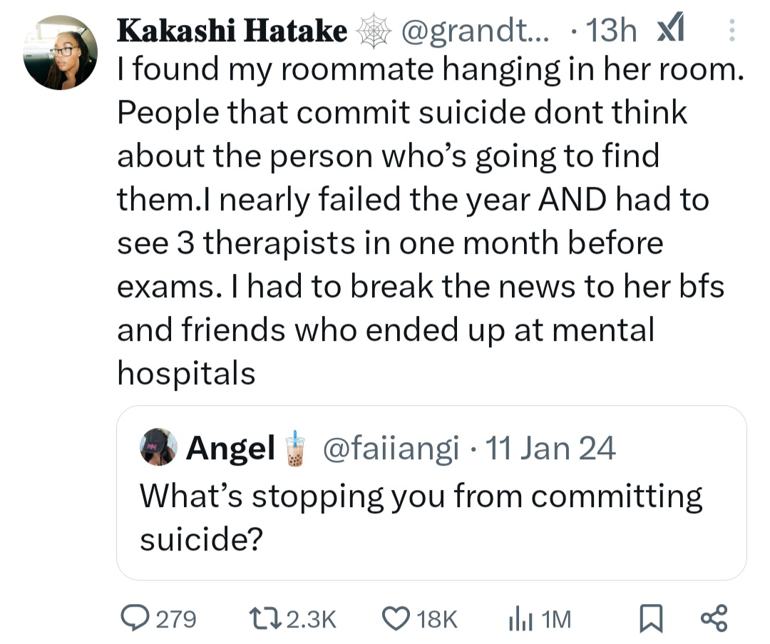 It all began with a question on X that goes: "What's stopping you from committing su!cide?"