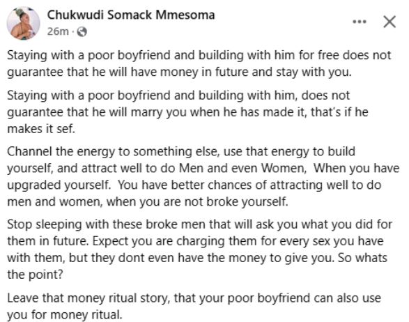 A Nigerian woman, Chukwudi Mmesoma, has advised women to stop sleeping with broke men.