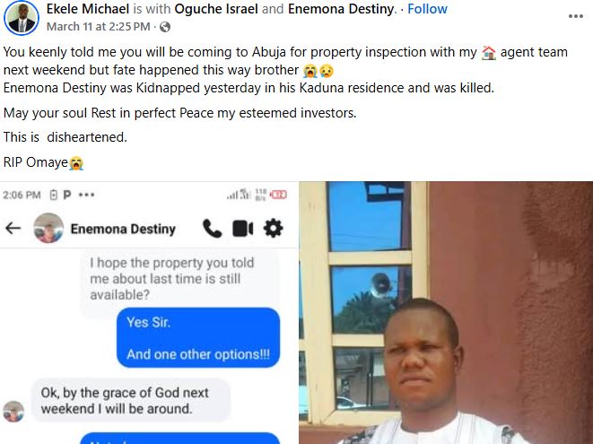 “You keenly told me you will be coming to Abuja for property inspection with my agent team next weekend but fate happened this way brother. Enemona Destiny was Kidnapped yesterday in his Kaduna residence and was k!lled. May your soul Rest in perfect Peace my esteemed investors. This is disheartened,” he wrote.