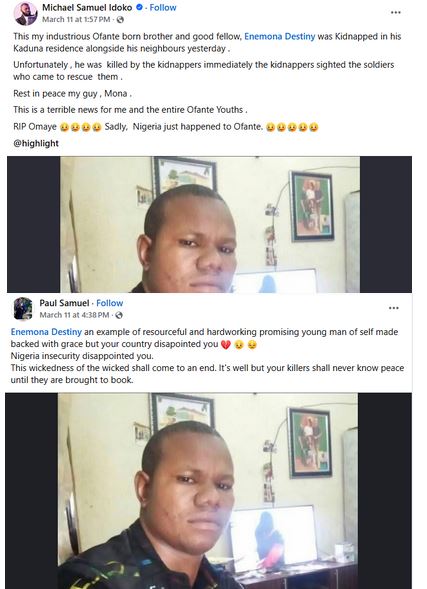 “This my industrious Ofante born brother and good fellow, Enemona Destiny was Kidnapped in his Kaduna residence alongside his neighbours yesterday. Unfortunately , he was k!lled by the kidnappers immediately the kidnappers sighted the soldiers who came to rescue them. Rest in peace my guy. This is a terrible news for me and the entire Ofante Youths. RIP Omaye. Sadly, Nigeria just happened to Ofante,” he wrote.