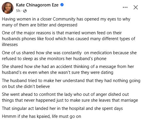 A Nigerian woman, Kate Chinagorom Eze, has opined that many married women are bitter and depressed because they constantly monitor their husbands' phones.