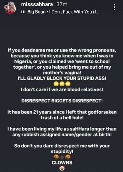 “If you deadname me or use the wrong pronouns, because you think you knew me when I was in Nigeria, or you claimed we went to school together, or you helped bring me out of my mother's vagina! I will gladly block your stupid ass! I don't care if we are blood relatives!,” she wrote.