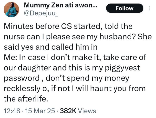 A new mum has gone online to recount the conversation that she had with her husband as she prepared to undergo C-section.
