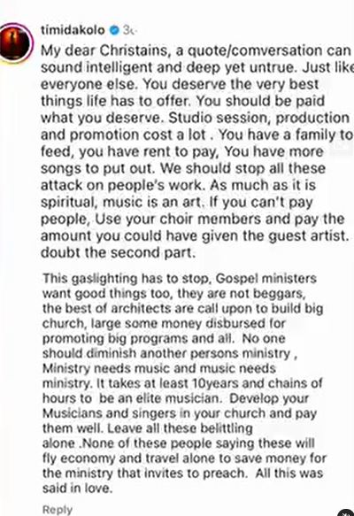 “As much a it is spiritual, music is an art. If you can’t pay people, use your church choir members and pay the amount you could have given the guest artist. I doubt the second part. This gaslighting has to stop. Gospel ministers want good things too, they are not beggars, the best of architects are call upon to build big church, large sum money are disbursed for promoting big programs and all.