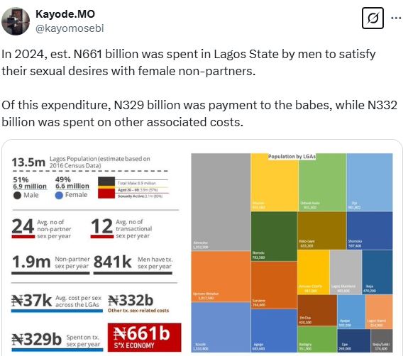 Beyond the direct payments to s3x workers, Lagos men spent N332 billion on associated costs.