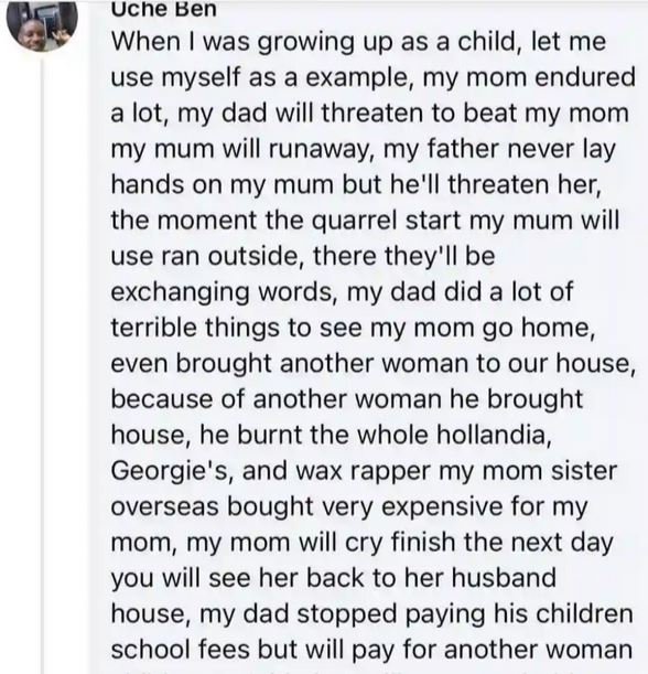 A Nigerian man, Uche Ben has gone viral on Facebook after he recounted the series of abuse his mother endured at the hands of his father.