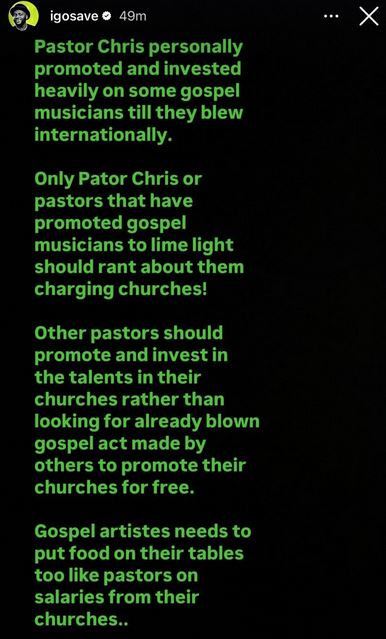 He argued that Pastor Chris Oyakhilome invested and promoted some gospel artists into the limelight and that only he and other pastors who have invested in artists can complain about being charged by gospel singers.