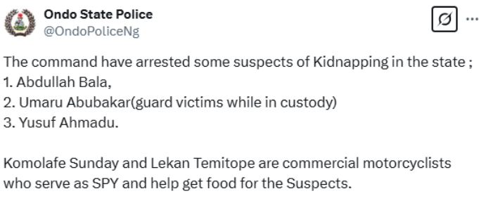 The Commissioner of Police in the state, CP Wilfred Afolabi, who disclosed this in a statement on Tuesday, March 18, 2025, said the arrest of the suspects and their collaborators marked a significant victory in the fight against kidnapping.
